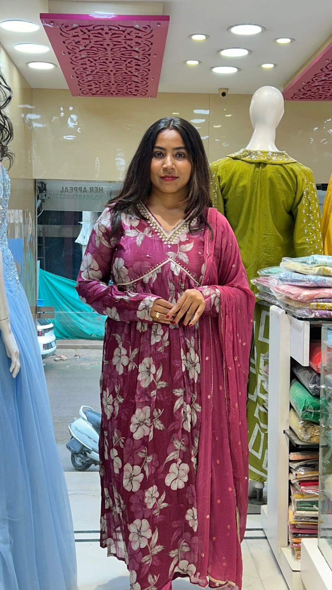 chinon blue floral print alia cut stylish salwar suit