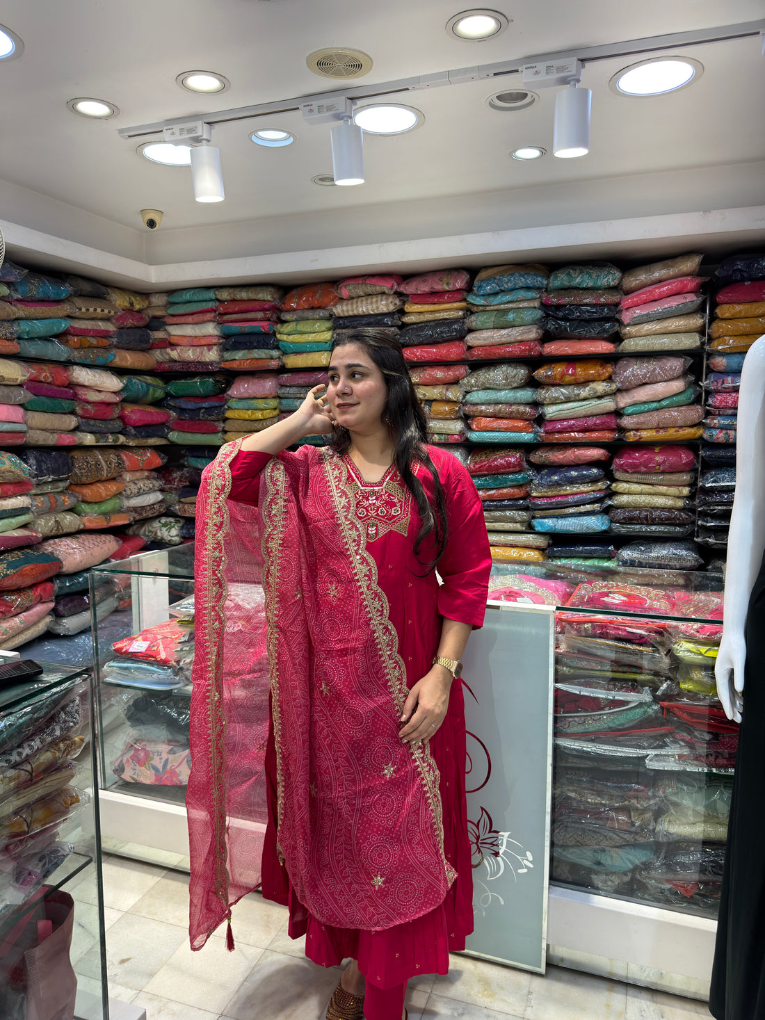 rani pink cotton casuals semi anarkali organza dupatta with embroidered neckline