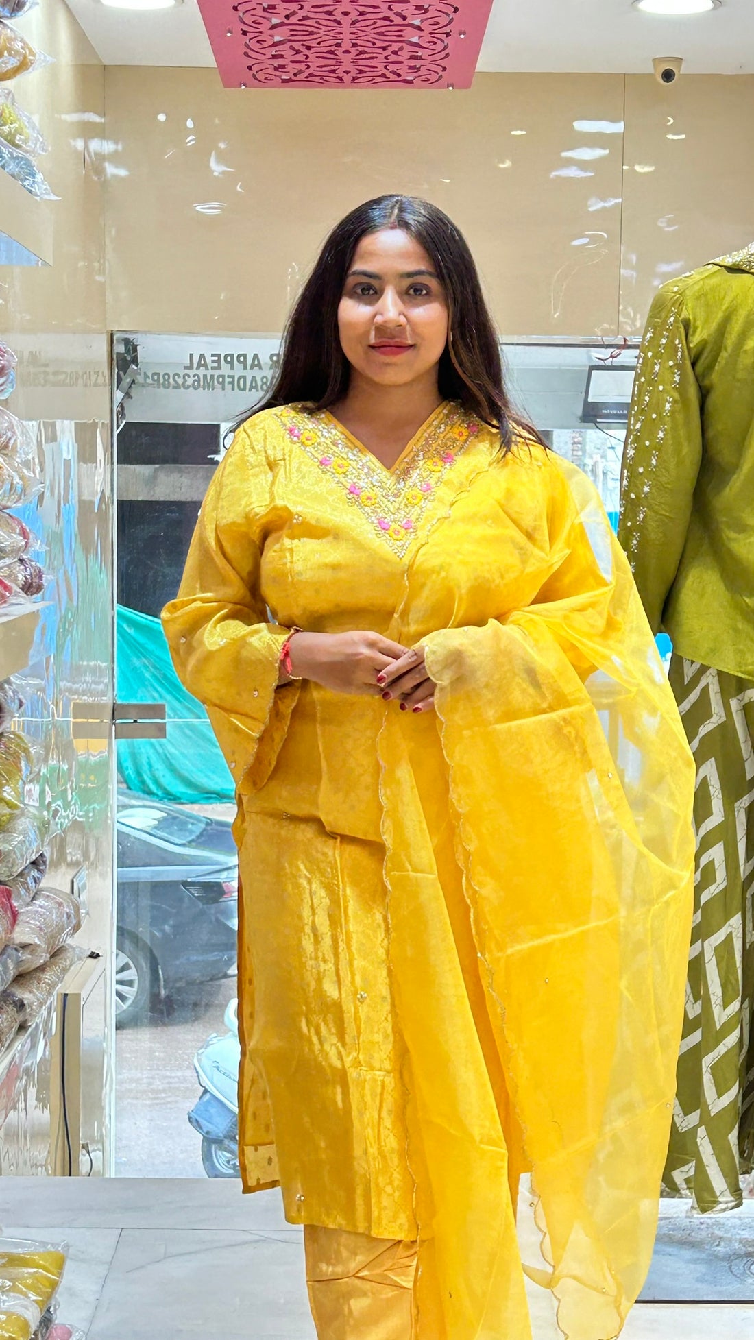 v neck yellow kurti pant set with organza dupatta
