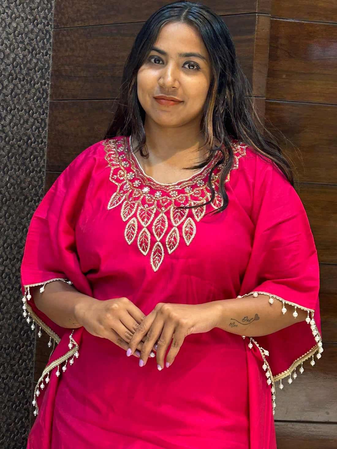 rani pink kaftan with zari moti neckline