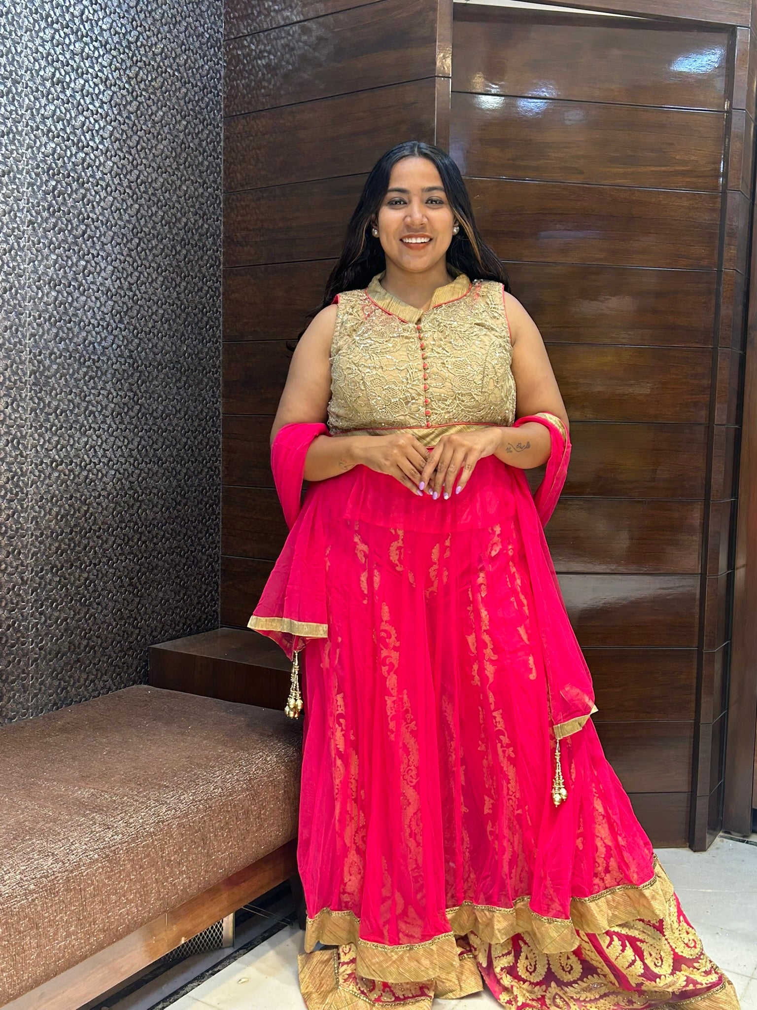 This exquisite Indo-Western wedding ensemble features a beautifully designed long top paired with intricately embroidered palazzo pants. Crafted for elegance and comfort, the detailed embroidery adds a rich, traditional touch while the modern silhouette ensures a flattering fit. Perfect for wedding celebrations, this attire seamlessly blends contemporary style with classic Indian craftsmanship, making it a standout choice for festive occasions.