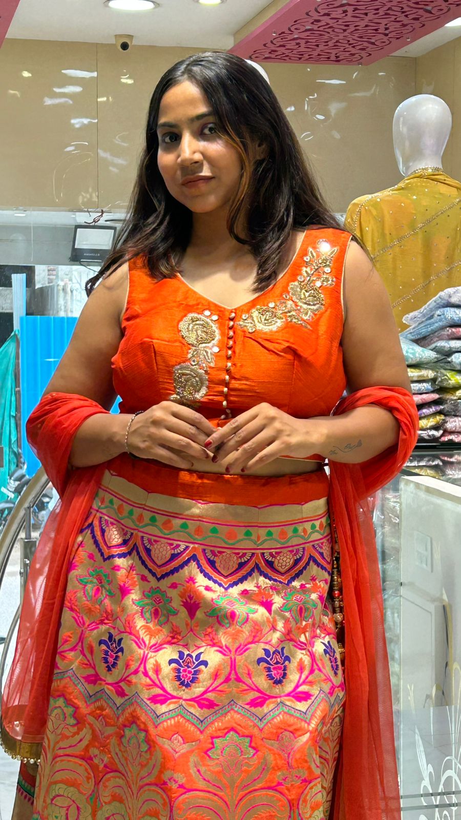 Elevate your festive wardrobe with this Banarasi Lehenga Silk Top featuring exquisite patchwork craftsmanship. Made from premium raw silk, this Indo-western ensemble combines traditional elegance with contemporary style. The richly textured fabric and detailed embroidery create a statement look perfect for parties and special occasions, ensuring both comfort and charm throughout your event.