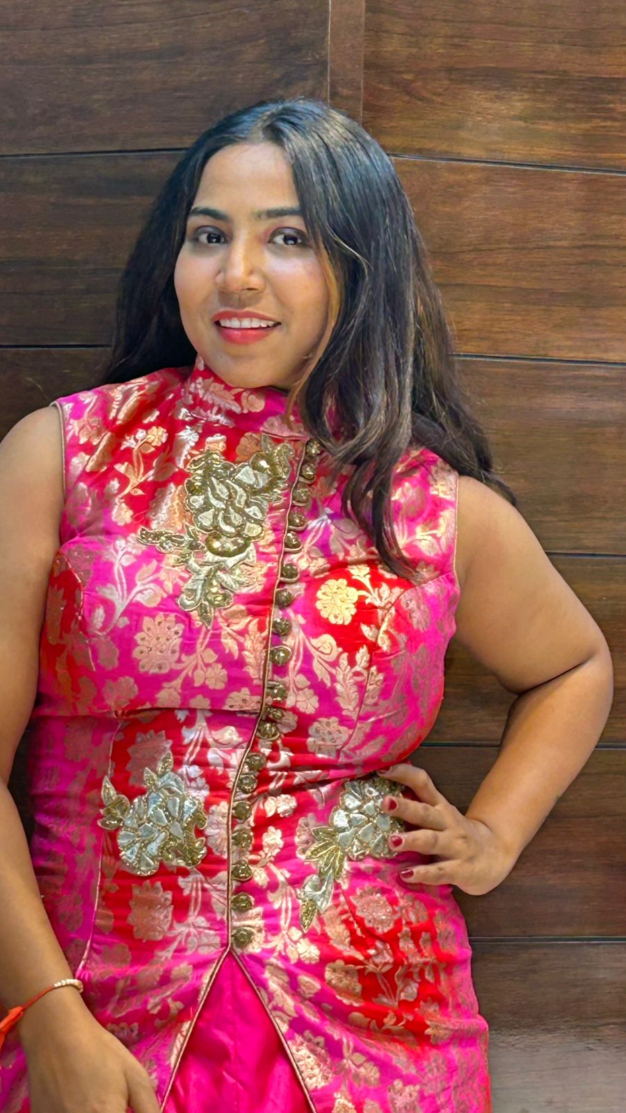 This Banarasi pure Chinese collar designer Indo Western outfit features a long top crafted from luxurious Banaras fabric paired with a flowing lehenga made of pure georgette. Designed to offer a sophisticated and elegant silhouette, it is an ideal choice for weddings and parties, blending traditional craftsmanship with contemporary style. The fine materials ensure comfort while elevating your festive wardrobe with timeless appeal.