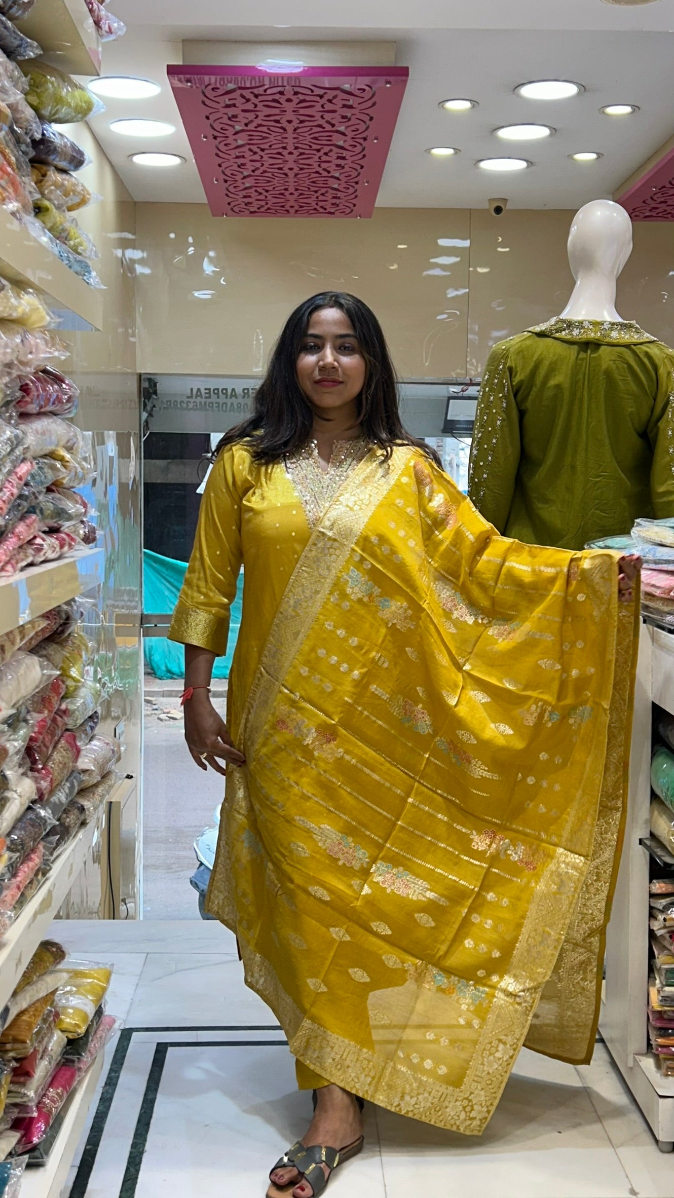 This Banarasi yellow kurti pant set features a stylish V-neck kurti paired with a traditional Banarasi dupatta. The rich yellow hue enhances the intricate Banarasi weaving, offering a vibrant yet elegant appeal. Crafted to provide both comfort and a flattering fit, the ensemble is perfect for festive occasions or formal events, combining classic artistry with contemporary style for a refined ethnic statement.