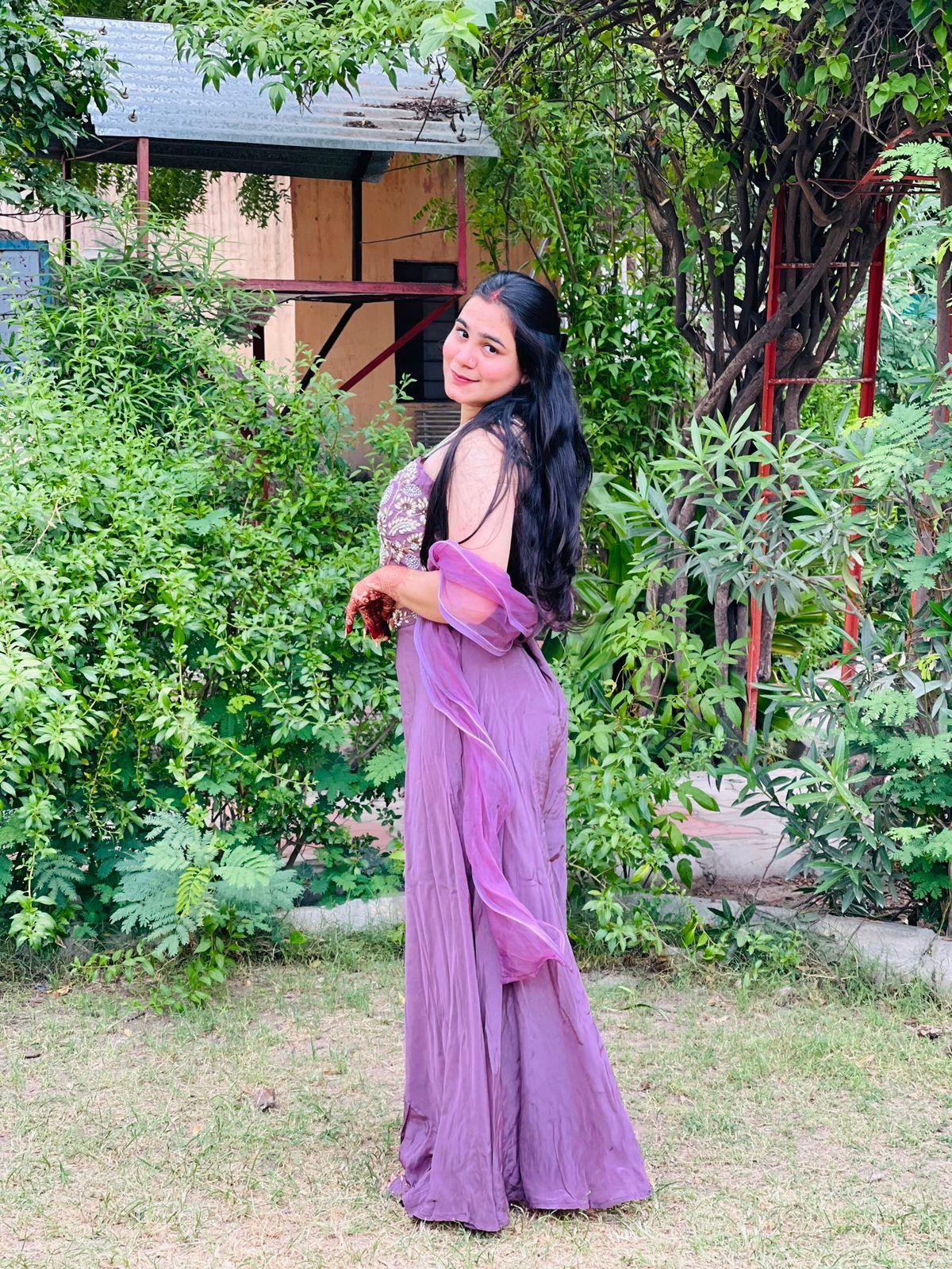 Pure crepe fabric with stylish blouse top in pearl motifs and sequence work done with plazzo bottom in lavender colors