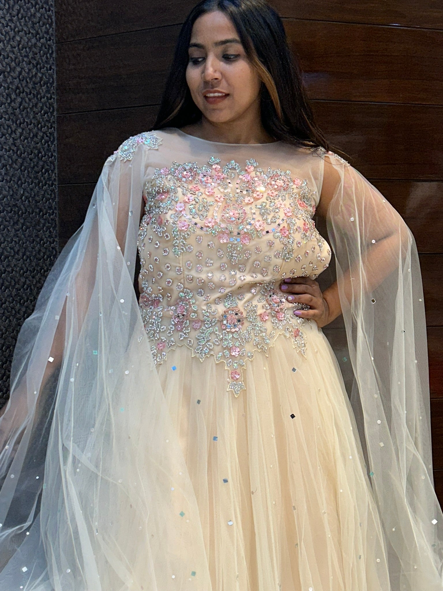 This elegant partywear gown features long selfie sleeves and intricate leafy mirror stone detailing, combining traditional craftsmanship with modern design. Its refined embellishments catch the light beautifully, making it perfect for festive occasions and evening events where you want to stand out with subtle sophistication. The gownβs flattering silhouette ensures comfort and style, making it an exceptional choice for celebrations.