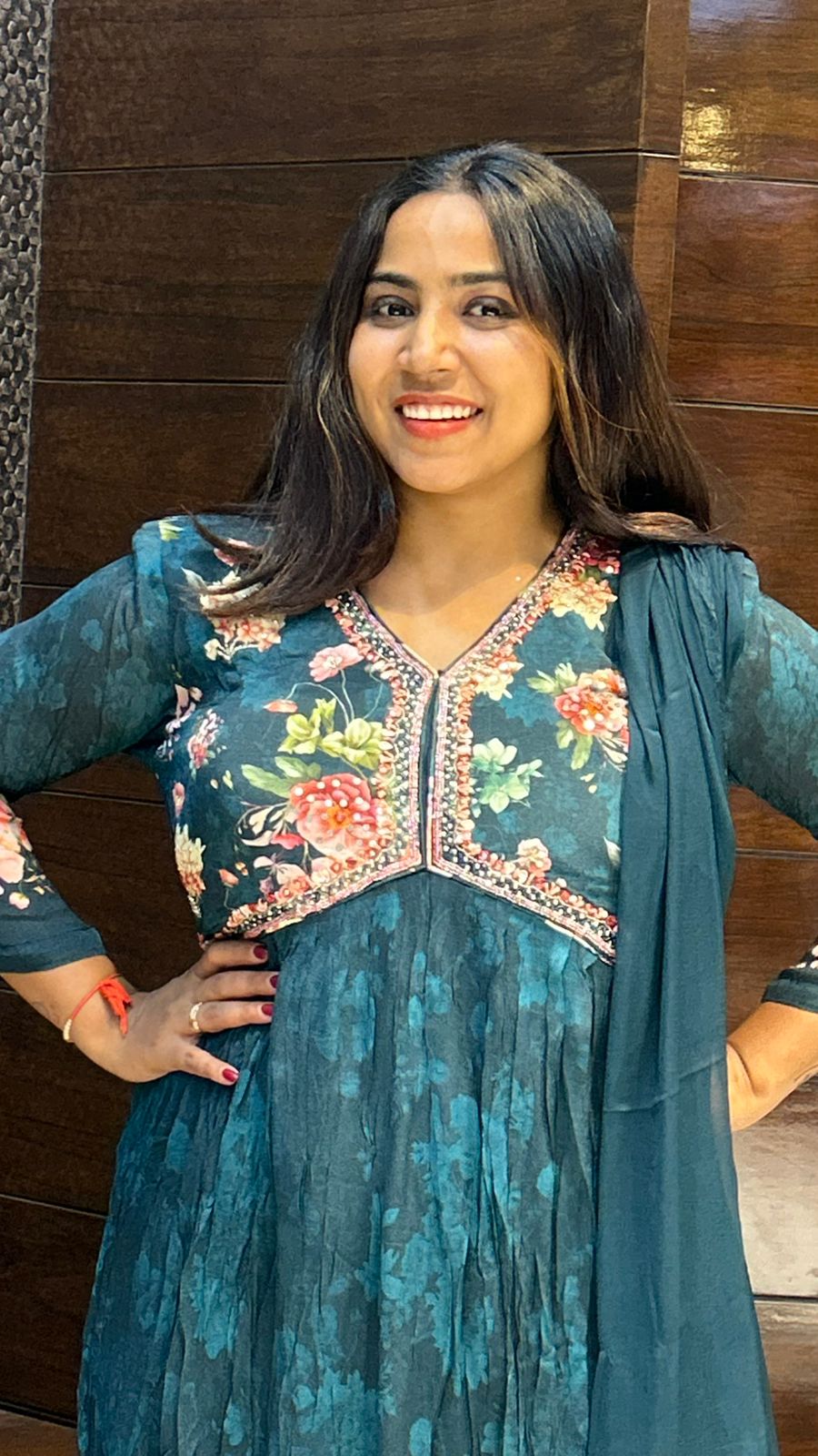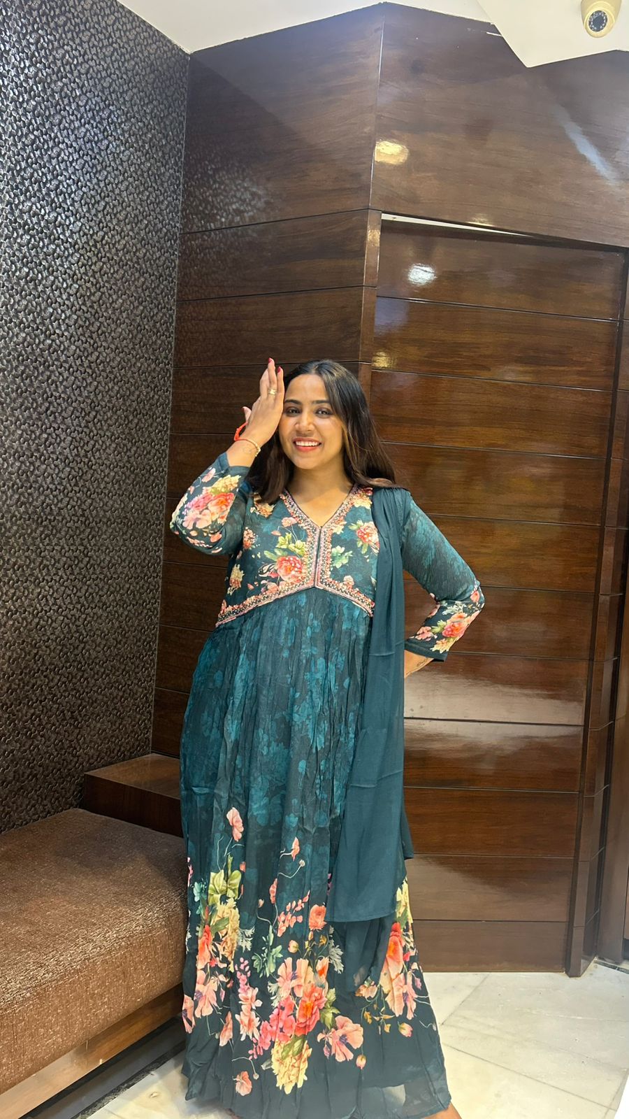 Crafted from premium chinon fabric, this one-piece designer gown features an exquisite floral print that enhances its elegant silhouette. The lightweight, flowing material ensures comfortable wear while delivering a refined, sophisticated look suitable for special occasions. Perfect for those seeking a blend of luxury and style, this gown stands out with its delicate texture and timeless floral design.