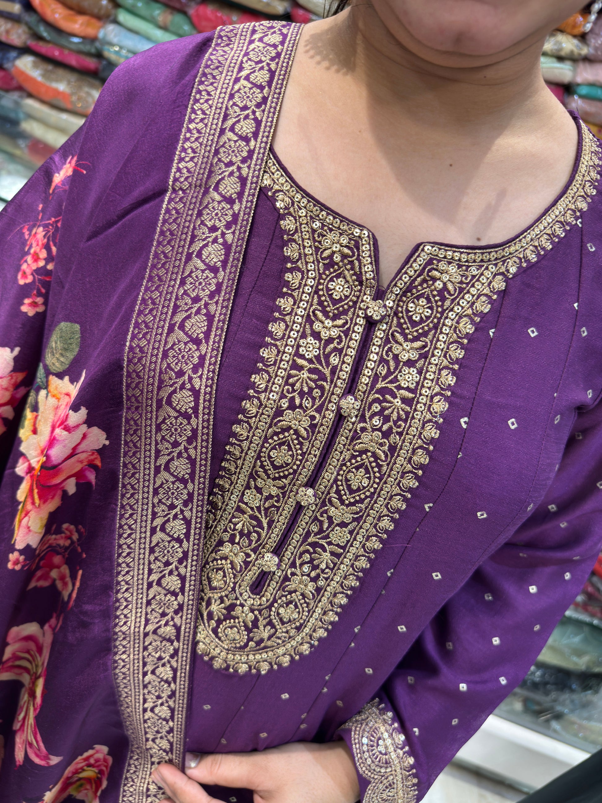 Elevate your festive wardrobe with this partywear embroidered neckline dola silk anarkali suit. Crafted from rich dola silk, it offers a graceful sheen and smooth texture, ensuring comfort throughout your celebrations. The meticulously embroidered neckline adds a refined focal point, enhancing the traditional silhouette. Perfect for special occasions, this anarkali suit combines elegance with timeless craftsmanship for a distinguished and sophisticated look.