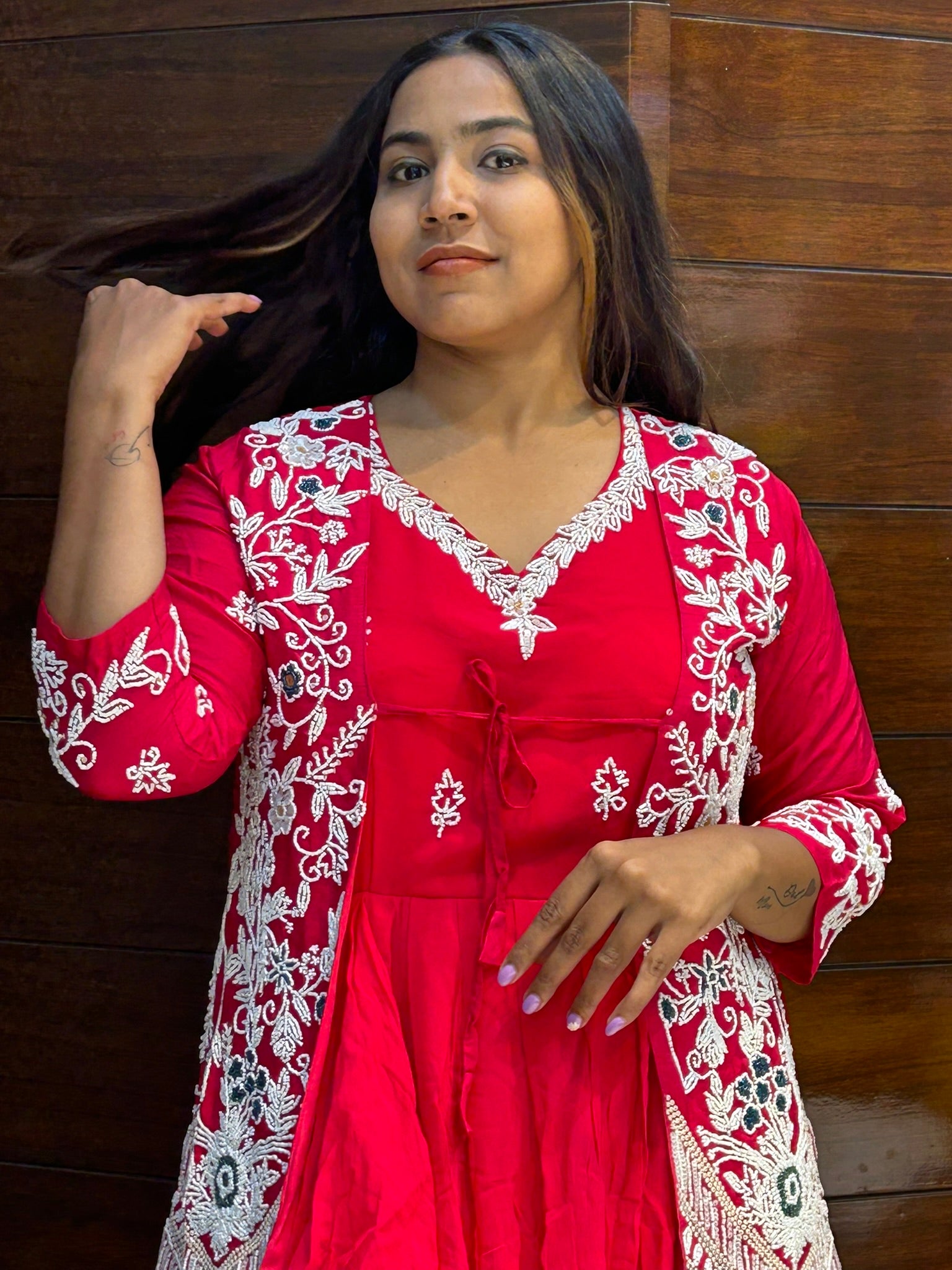 Elevate your wedding and party ensembles with this exquisite pearl moti work jacket paired with a graceful long gown. The intricately crafted pearl embellishments on the jacket add a timeless elegance, enhancing the sophisticated silhouette of the flowing gown. Perfectly blending traditional craftsmanship with contemporary style, this set offers both comfort and distinction, making it an ideal choice for memorable occasions.