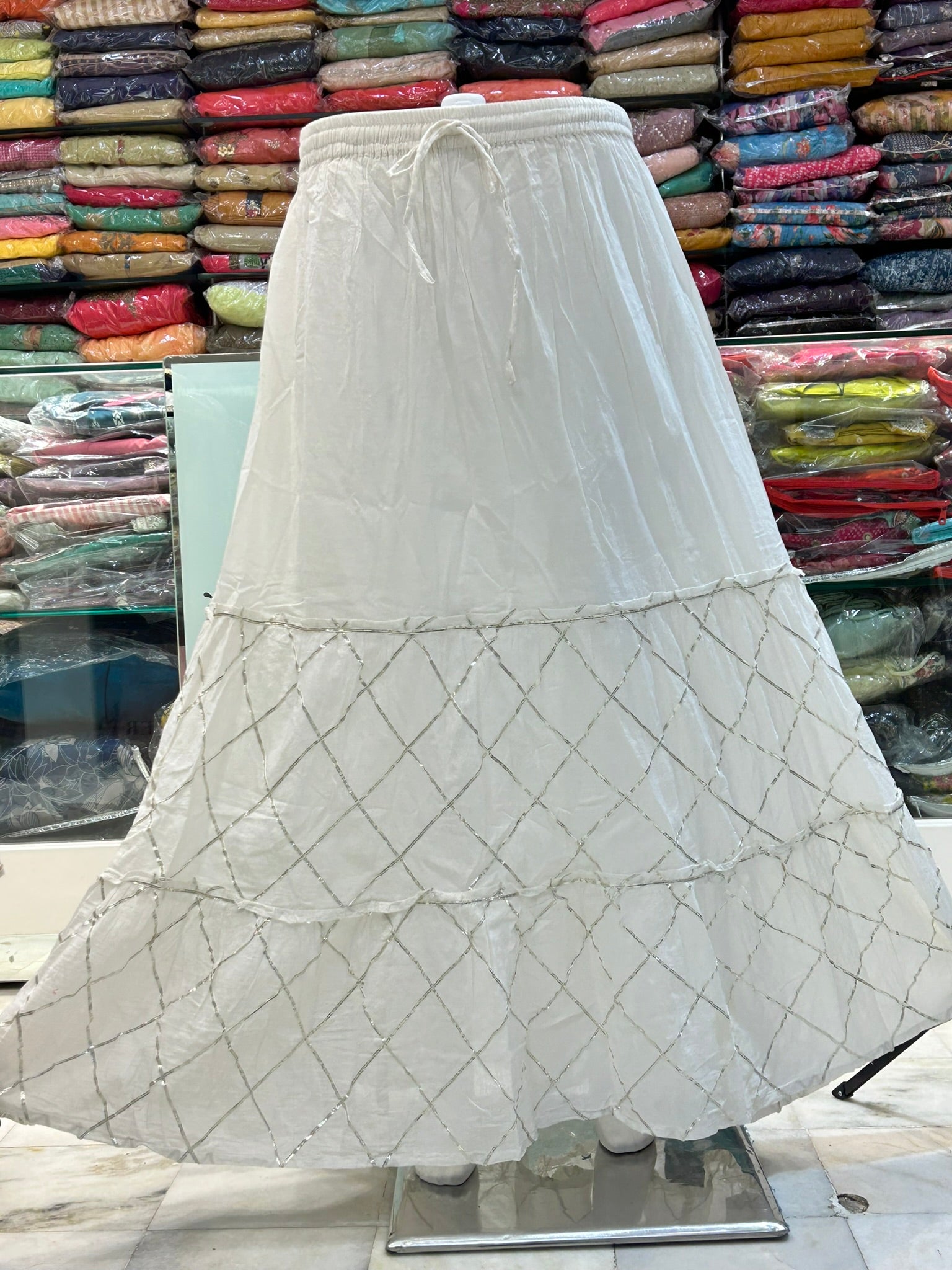 This skirt is crafted from pure white cotton, offering breathable comfort and natural softness. It features delicate gotta lace embellishments that add an elegant, handcrafted touch. Ideal for warm weather, this skirt combines traditional craftsmanship with modern simplicity, making it a versatile addition to any wardrobe.