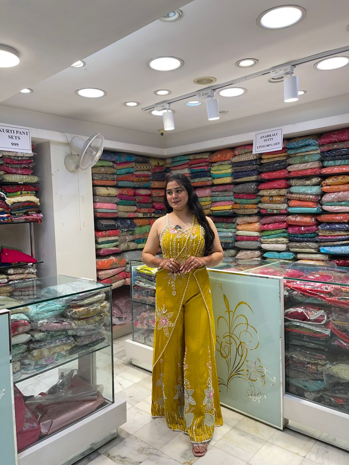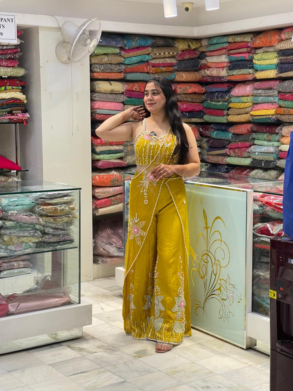 Elevate your festive and partywear style with this chic indo-western plazzo set. Featuring a beautifully crafted net shrug embellished with delicate pearl moti and shimmering sequin work, this outfit blends modern flair with traditional charm. Perfect for weddings, receptions, sangeet nights, and festive gatherings, the elegant design ensures a graceful yet trendy look. Style it with statement earrings and heels for the perfect ensemble.