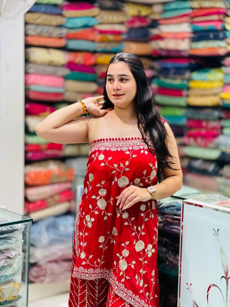 Elevate your ethnic wardrobe with this Indo-Western plazzo crafted from lightweight georgette fabric, featuring intricate zari thread work. Designed for a graceful drape and comfortable fit, it blends traditional craftsmanship with contemporary style, perfect for festive occasions or elegant gatherings.
