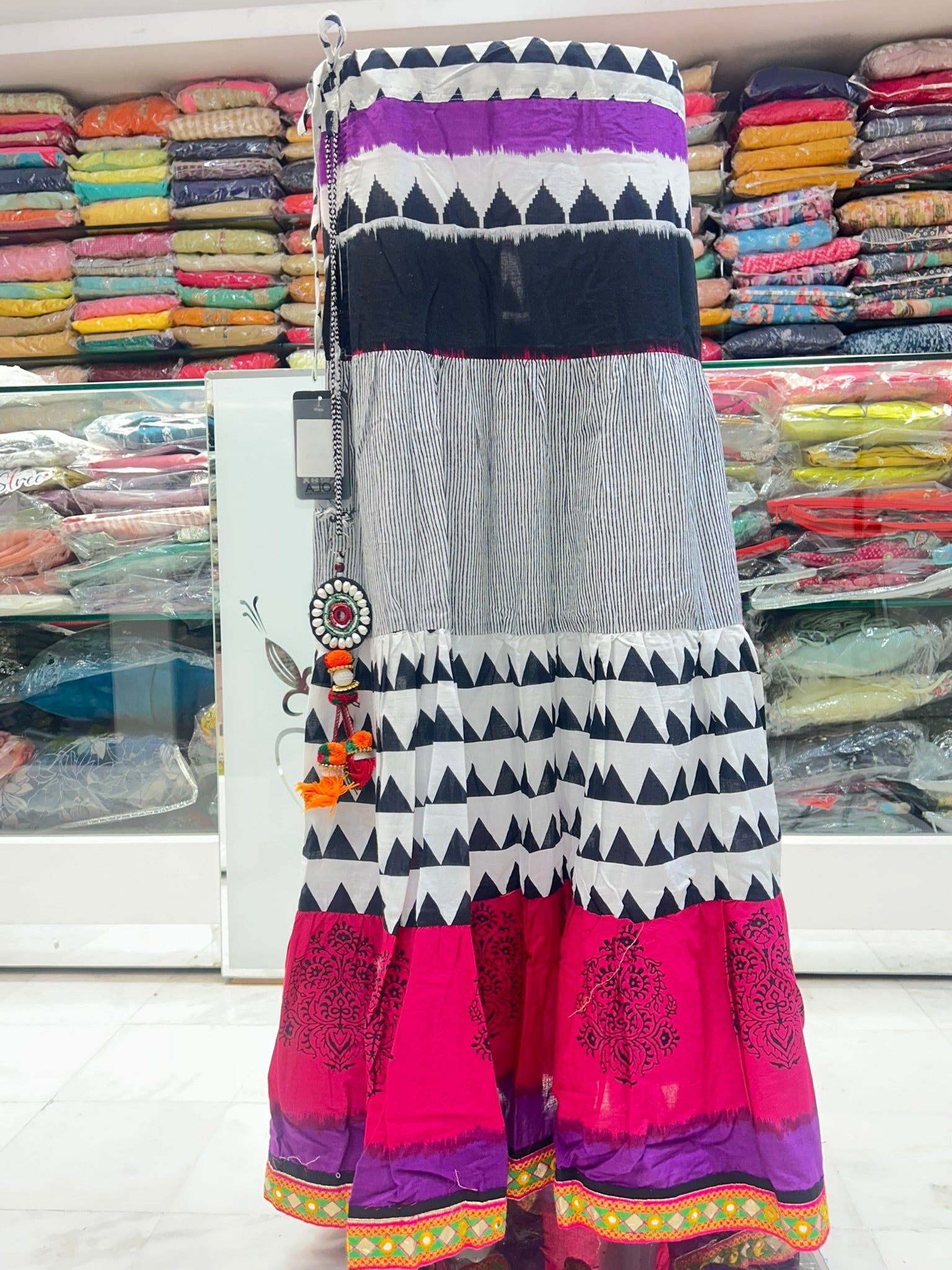 This printed hand-blocked skirt is crafted from a blend of rayon and cotton, offering both breathability and a soft, smooth texture. Featuring multicolor patterns created through traditional hand-blocking techniques, it brings an authentic artisanal touch to your wardrobe. Ideal for comfortable everyday wear or casual outings, this skirt combines cultural heritage with modern comfort and style.