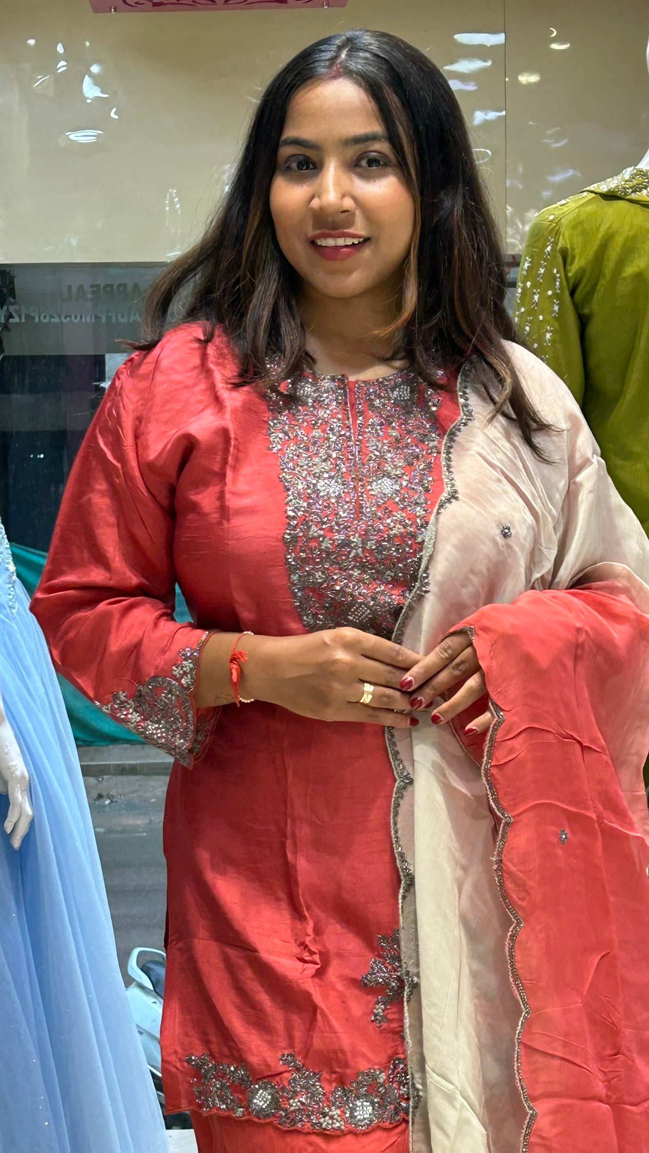 Elevate your festive wardrobe with this pure crepe sharara suit in a rich dark peach hue. Crafted from premium crepe fabric, it offers a smooth, comfortable drape while the intricate metallic work adds a sophisticated shimmer. The sharara design enhances movement and grace, making it ideal for special occasions and celebrations. This blend of traditional craftsmanship and contemporary style ensures a timeless yet elegant look.