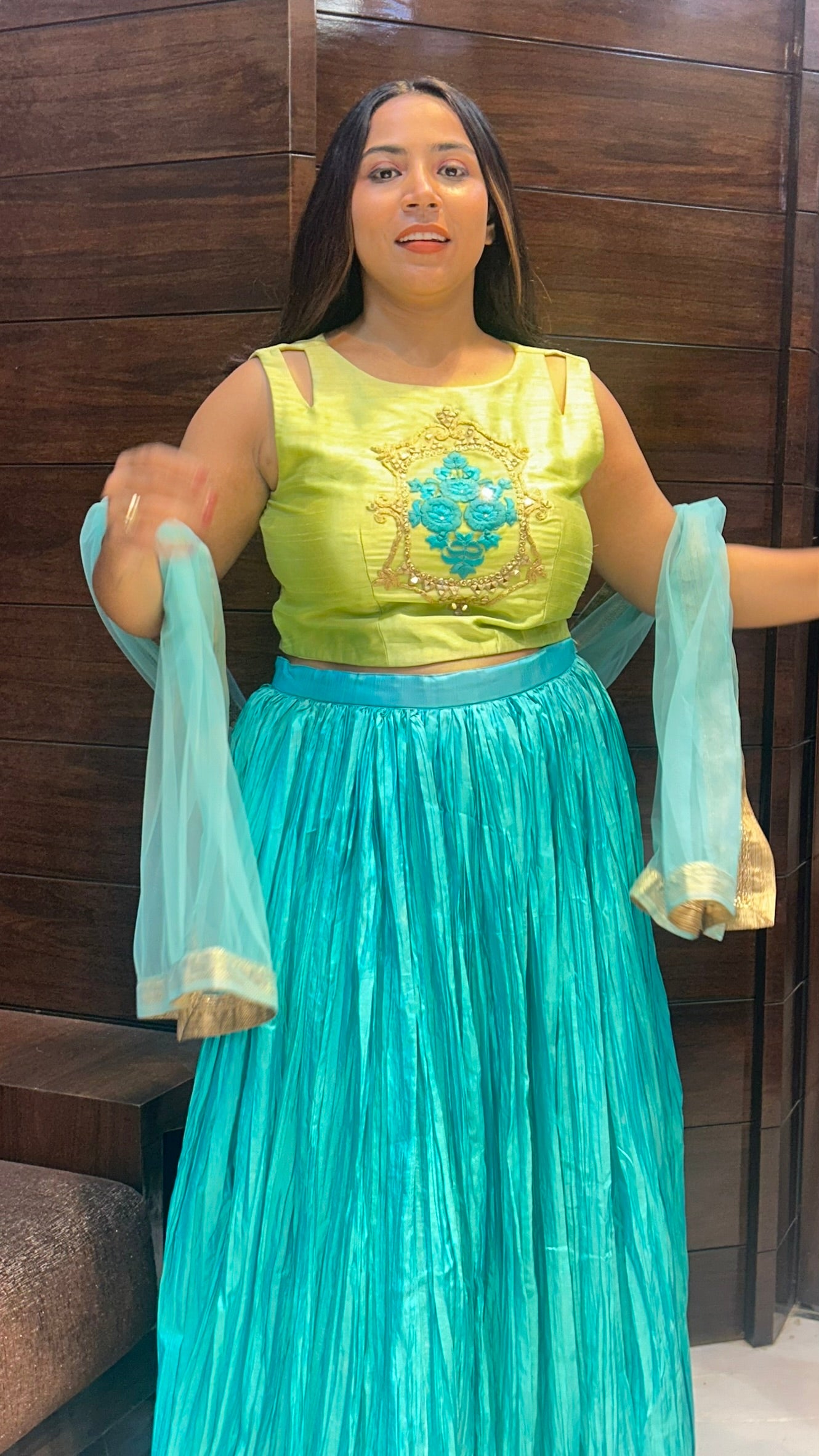 pure crepe partywear lehenga with silk embroidered top