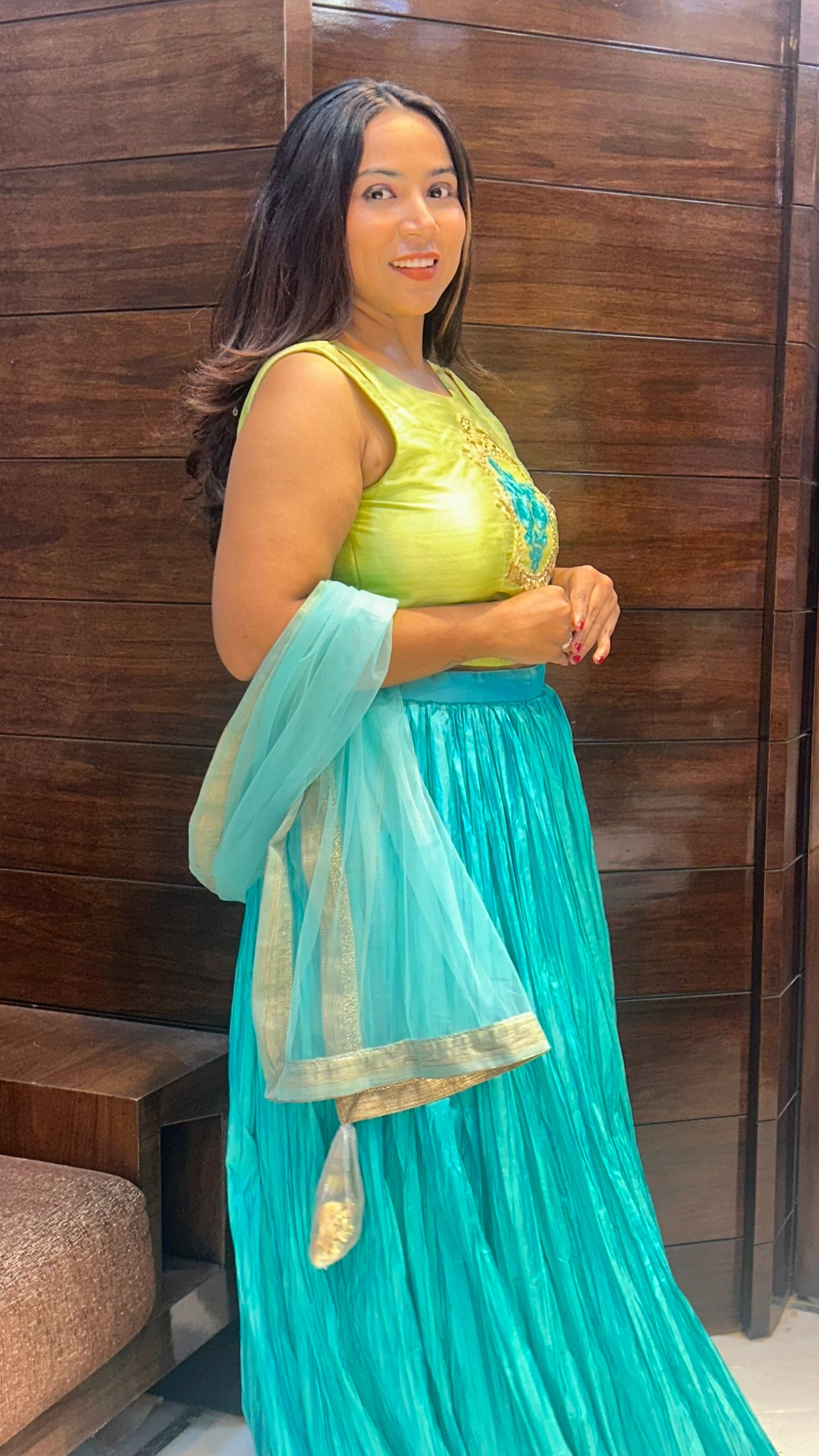 Elevate your festive wardrobe with this pure crepe partywear lehenga, paired with a finely crafted silk embroidered top. The lightweight crepe fabric ensures comfortable movement, while the exquisite silk embroidery adds a refined touch of elegance, making it ideal for special occasions. This ensemble blends traditional craftsmanship with contemporary style for a graceful, polished appearance.