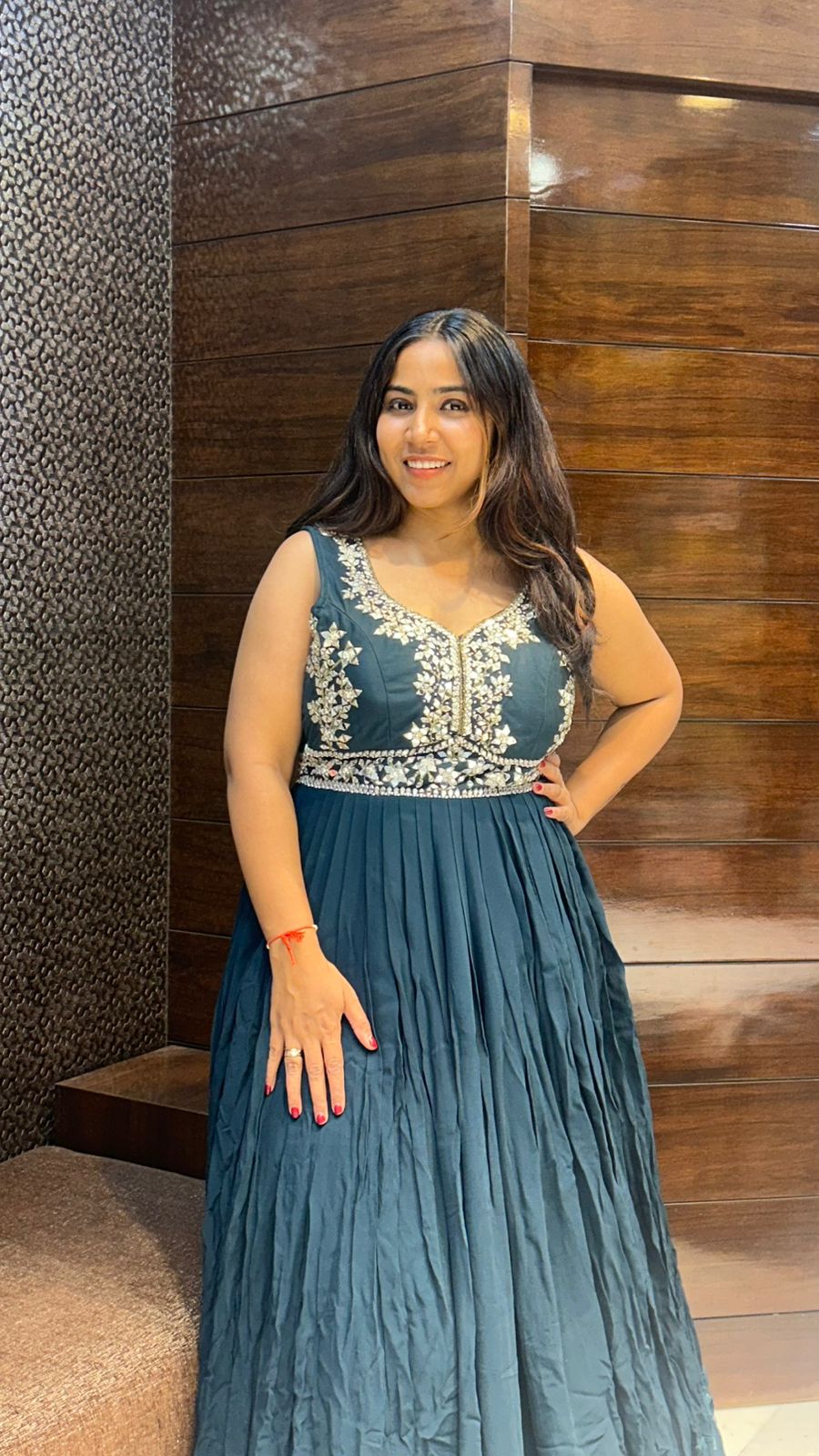 This partywear gown is crafted from pure fabric, featuring exquisite gotta patti and eplic work that adds a refined touch of elegance. Ideal for festive occasions or special events, its intricate detailing and high-quality material ensure both comfort and style, making it a standout piece in any wardrobe.