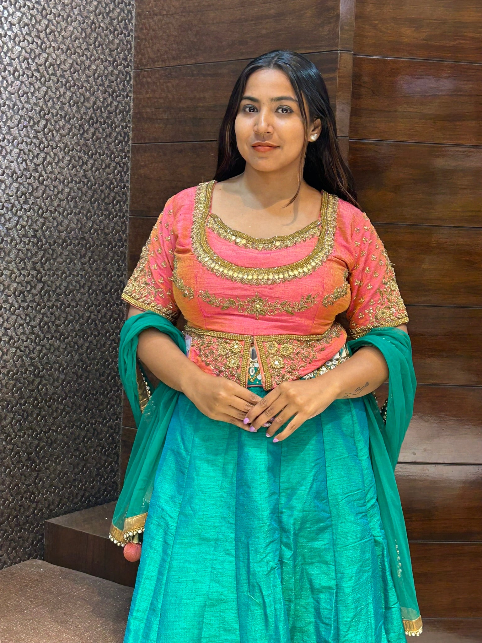 Crafted from pure raw silk, this lehenga top features intricate zari and zardosi embroidery, embodying traditional elegance perfect for weddings. The rich texture of raw silk combined with detailed metallic threadwork enhances its regal appeal, making it an exquisite choice for bridal or festive wear. Designed to complement your wedding ensemble, it offers both sophistication and timeless craftsmanship.