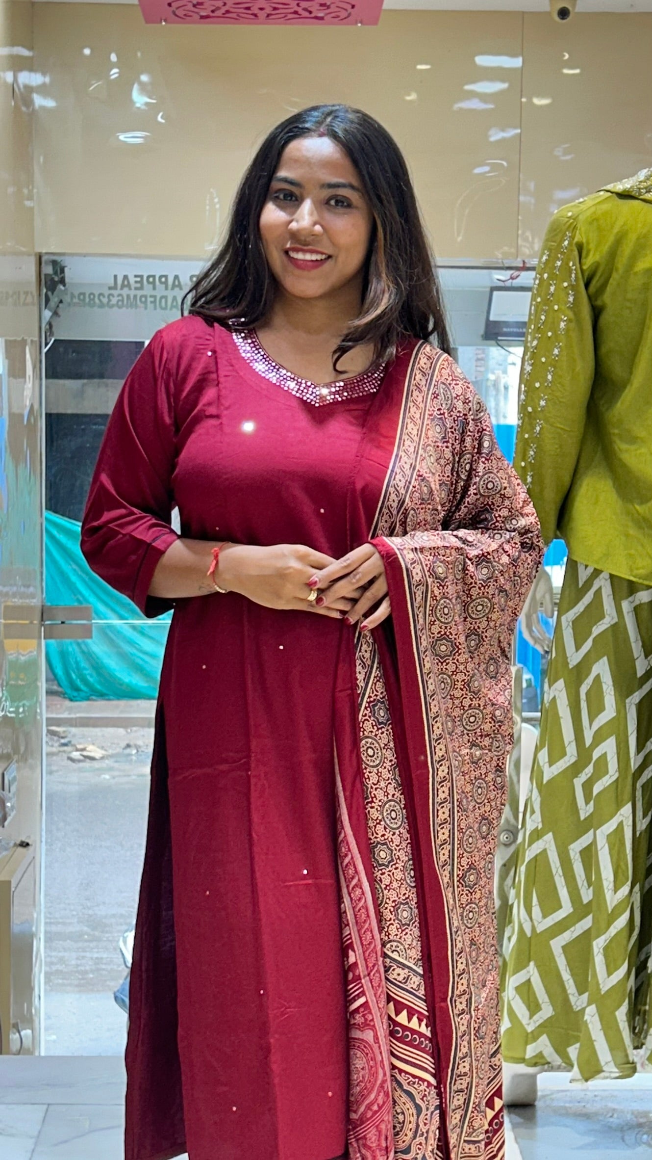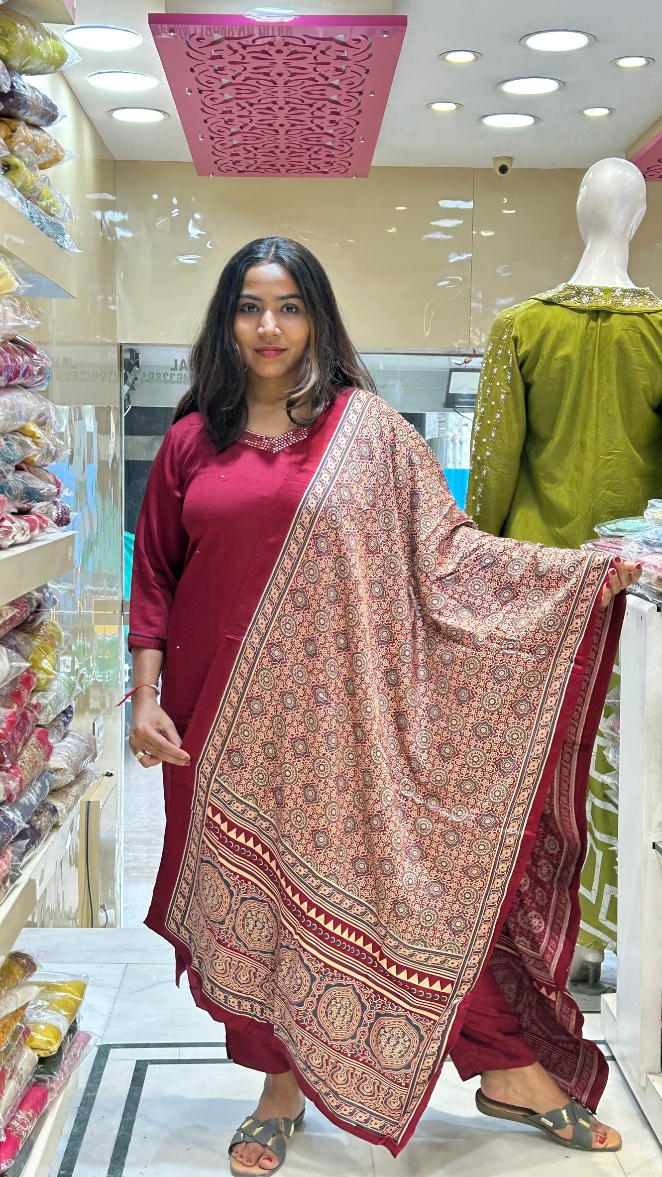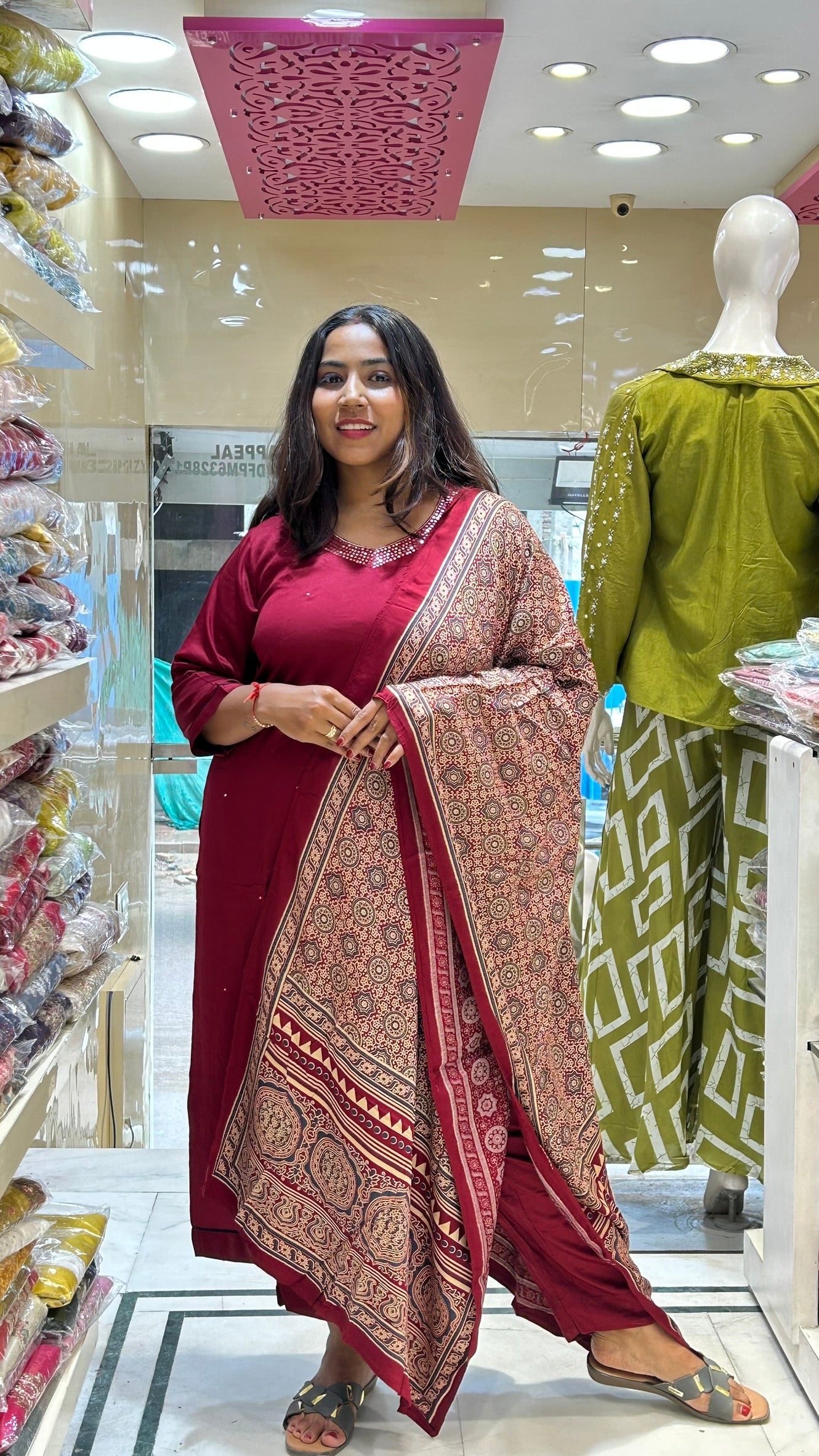Experience timeless elegance with this rust brown dola silk kurta set, featuring a traditional printed dupatta that beautifully complements the rich silk fabric. The breathable dola silk offers a soft drape and subtle sheen, enhancing your ethnic wardrobe with comfort and sophistication. Perfectly crafted for festive occasions or cultural gatherings, this set merges classic design with artisanal craftsmanship, ensuring you stand out with refined style.