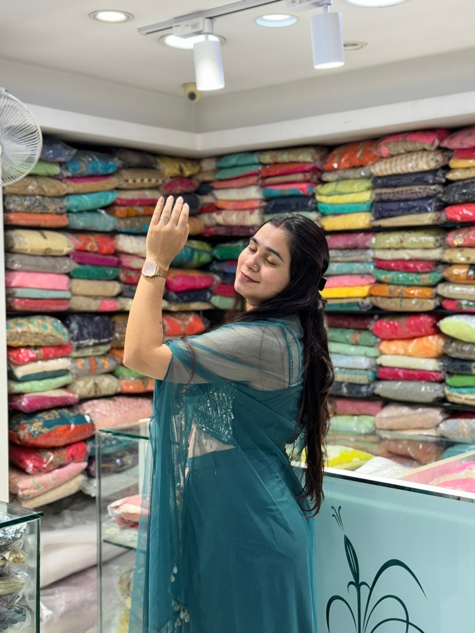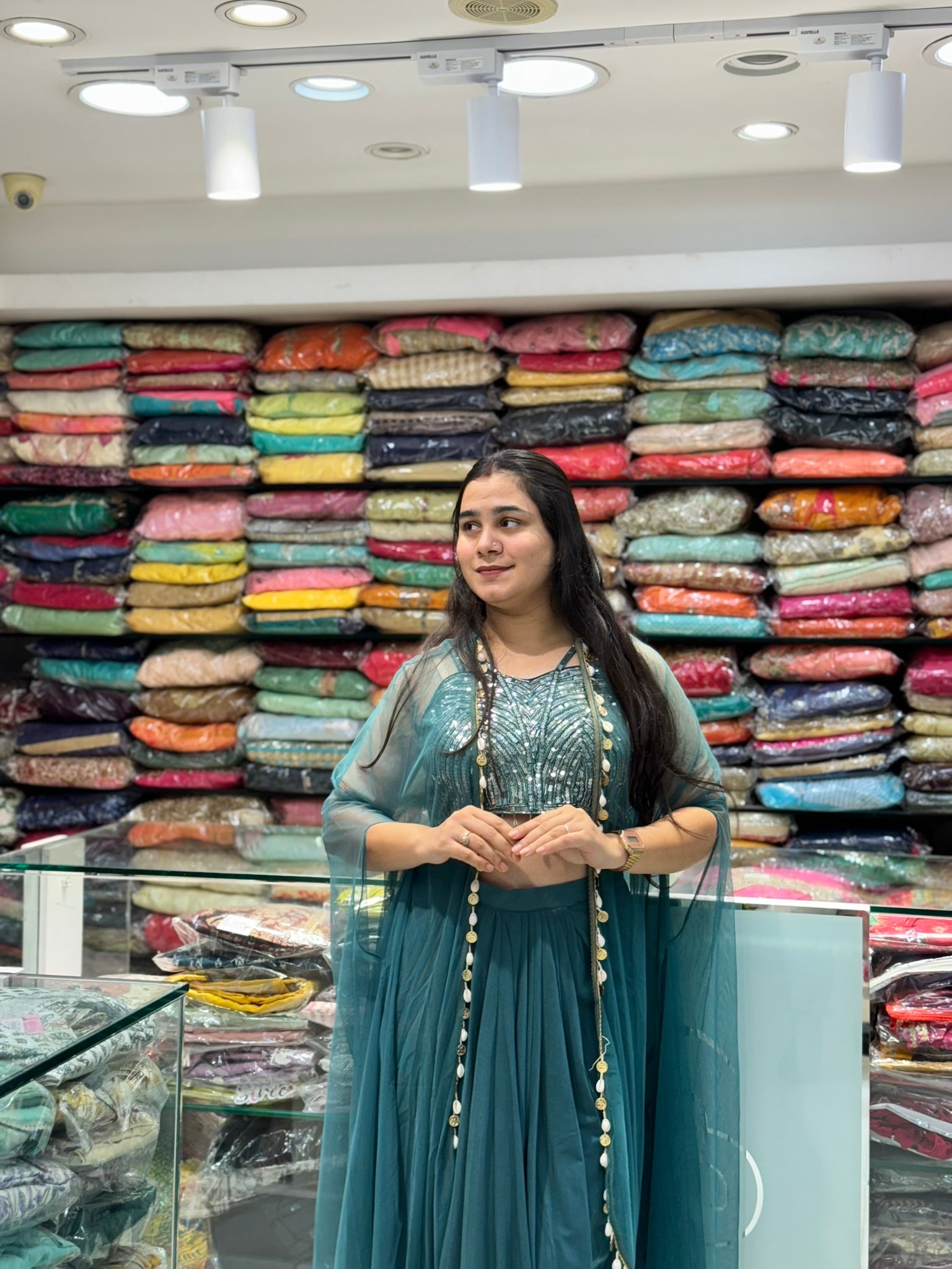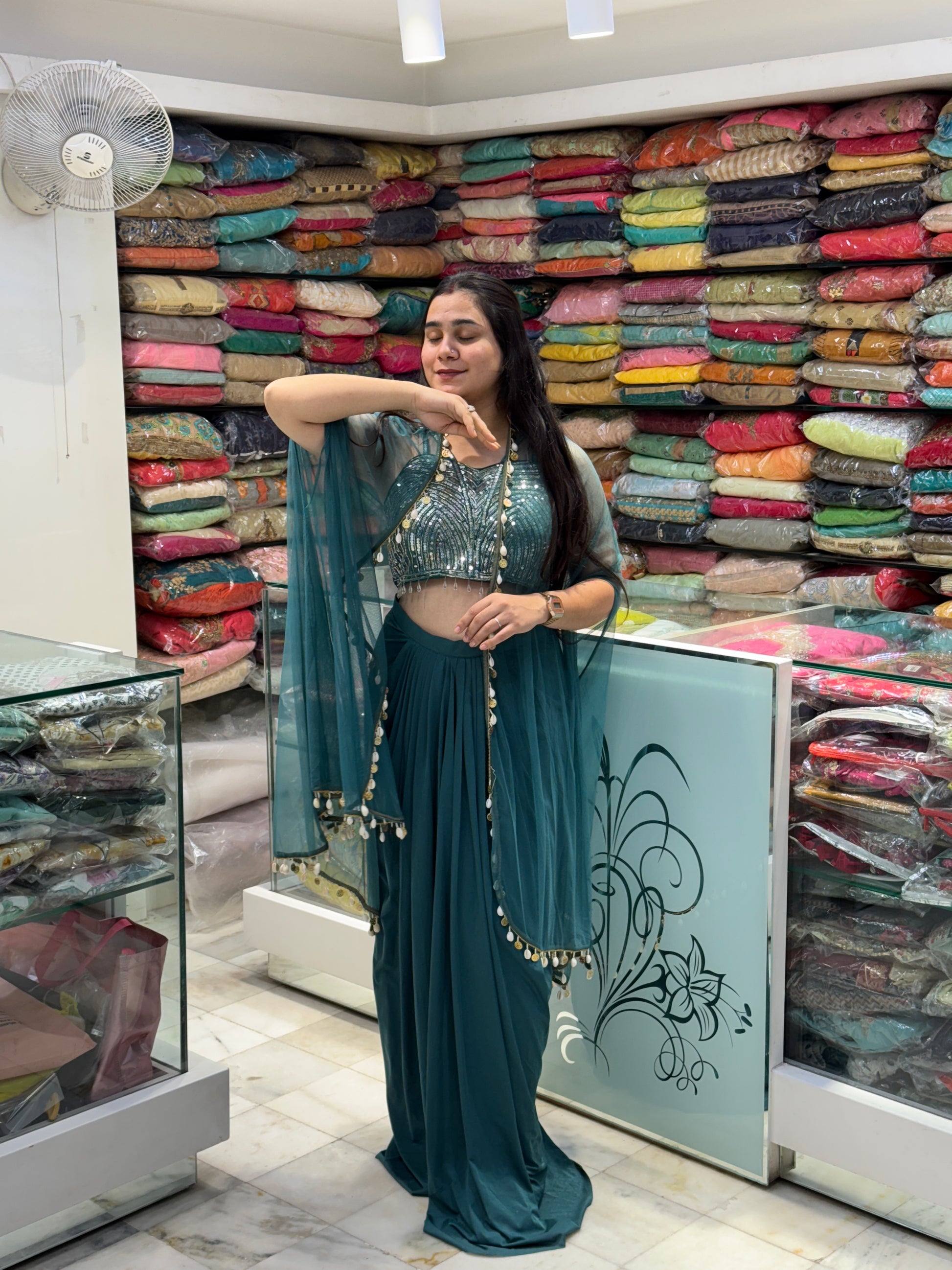 This teal green Indo-Western skirt features intricate sequence work that adds a subtle shimmer to its elegant cowl drape. Its contemporary silhouette blends traditional craftsmanship with modern style, making it versatile for festive occasions or stylish casual wear. Crafted for comfort and visual appeal, it pairs seamlessly with a variety of tops to create a refined ethnic fusion look.